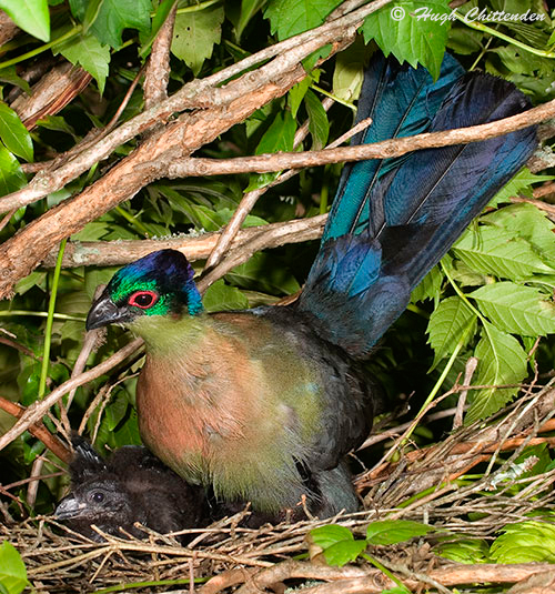 Purple-crested Turacos feed their ugly black chicks almost entirely on regurgitated fruit pulp.