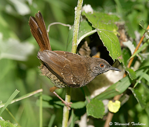 Barred Wren-Warbler perched in front of nest that is stitched into surrounding green leaves